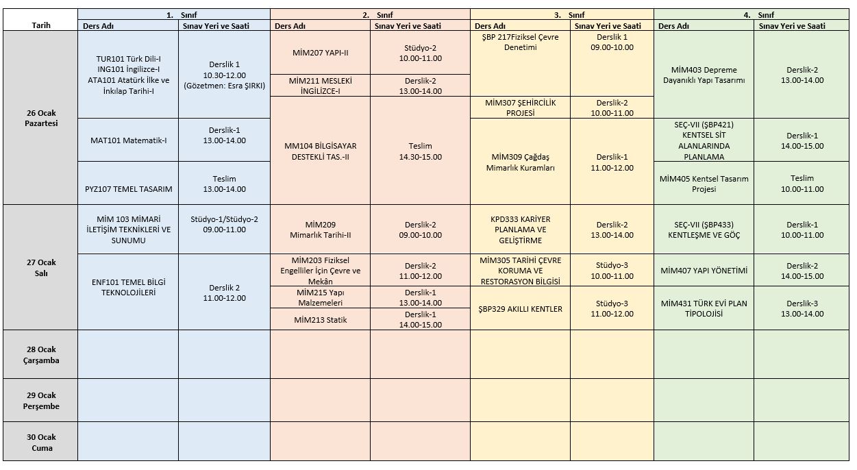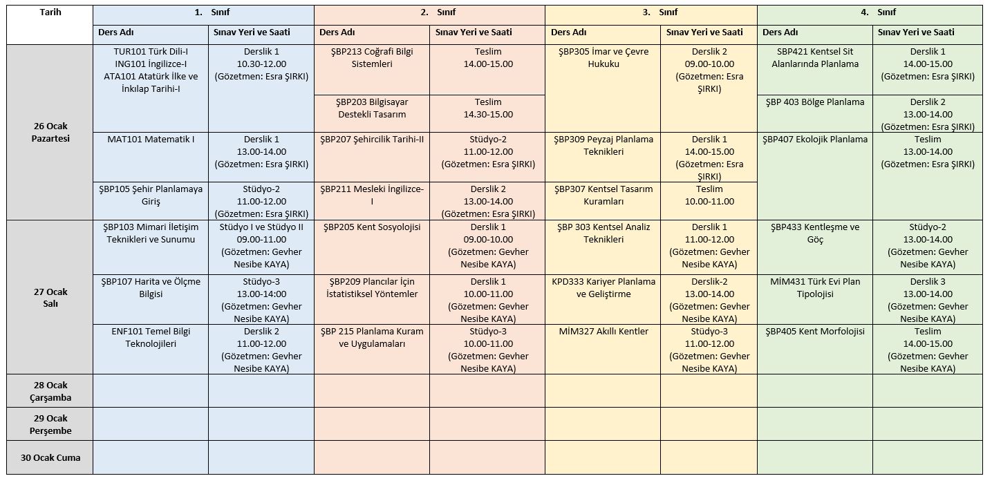 Şehir ve Bölge Planlama-Bütünleme Sınav Takvimi